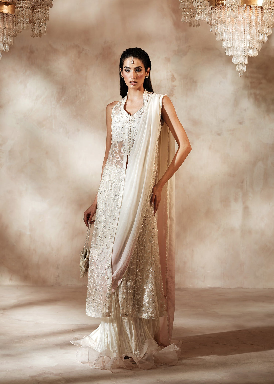 This beautiful ivory outfit definitely makes a style statement. It is paired with crushed lehnga...