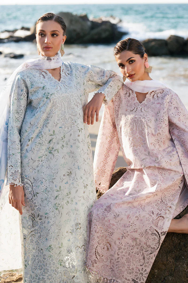 This fit captivates all-over prints with schiffli on soft-hued lawn shirt. The outfit is beautifully coordinated with a digitally printed silk dupatta and a matching trouser.