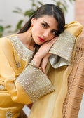 This butter yellow garment is intricately designed with a thick galla that is completely hand-embellished with bootis all over the shirt. Paired with khari shalwar, the ensemble is completed with a sequin-sprayed dupatta for a stylish and coordinated look