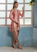This coral statement jacket beautifully embodies the fusion of boldness and enchantment. Crafted from luxurious silk tissue, the front-open design showcases intricate Elephant scenery, brought to life with stunning copper and silver zardoze embroidery. Itss perfectly paired with a sleek Korean silk tube top and draped shalwar in matching coral, creating a harmonious and captivating ensemble. Ideal for making a memorable impression at any occasion!