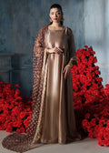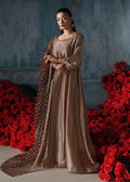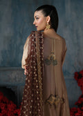 Commemorating sheer bliss, this plain coffee-colored lama pishwas is elegantly designed, featuring an alluring border on the sleeves and a striking peacock motif at the back. The look is enhanced by a dark-toned dupatta, heavily embellished with a stunning sequin jaal that adds a touch of opulence. This ensemble beautifully balances simplicity and intricate detail, making it a perfect choice for festive occasions or special celebrations.