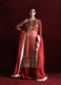For those who love to wear bold colors, along with a striking look,Rose� is the perfect design for you. This elegant dress features an organza base, delicately rendered floral motifs with jewel like pattern on a hue of red. The gold embellishments make the outfit very attractive and are paired with net lehnga with ruffle border.Â