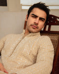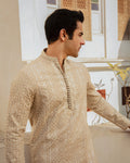 Description: Embodying grace, Aksel fuses vintage charm with contemporary edge. Cut from karandi in a unique bisque hue, the kurta features resplendent resham work, artistically arranged in linear patterns. Paired with karandi trousers, this set is sure to highlight your presence at every occasion.