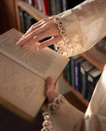 €œFee€� Luxuriously rendered in a soft, creamy white, this ensemble is a masterpiece of tone-on-tone embroidery, with delicate thread work that whispers elegance. The scalloped neckline and intricate floral motifs add a refined, feminine grace, elevating the entire silhouette. Paired with a delicate laser-cut straight culottes and an embroidered chiffon dupatta, this ensemble is the epitome of timeless, understated opulence.