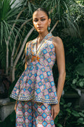 Discover effortless luxury in a quintessential painterly printed peplum top paired with a matching dhaka pajama. This flattering silhouette, cut from fine khaddi silk, stuns with a statement neckline embroidered with a pop of a tangerine lotus. The zardoze and gota details enhance the powder blue and pale pink alluring print.
