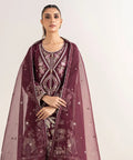 Make a statement in our embroidered purple viscose raw silk A-line shirt paired with matching flared trousers and a blended organza dupatta.