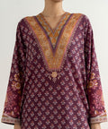 Make a statement in our printed purple A-line blended grip shirt with viscose raw silk trousers and a brochea jacquard dupatta.
