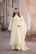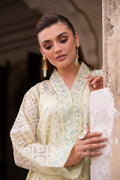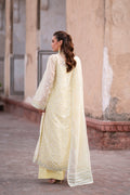 Zari jacquard lemon yellow long shirt with embroidered organza dupatta paired with wide-legged pants.