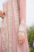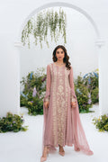 Turn heads at any musical event for the season with this vibrant ensemble. This subtly sophisticated chai-pink kalidaar features signature embroidery and handwork. The ensemble is paired with a laced-up chiffon dupatta.