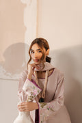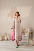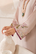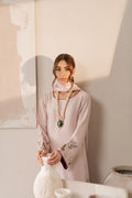 A striking blush pink rawsilk kaftan ensemble stuns with beautiful swan embroidered detailing in tones of lavender, green and purple. Lovely dupatta in three pastel tones adds up the perfect oomph to the outfit.
