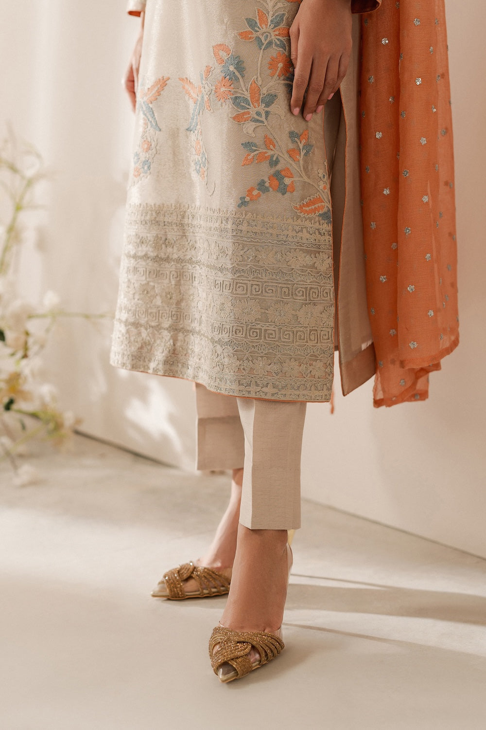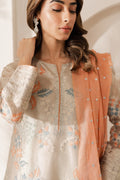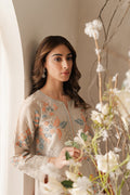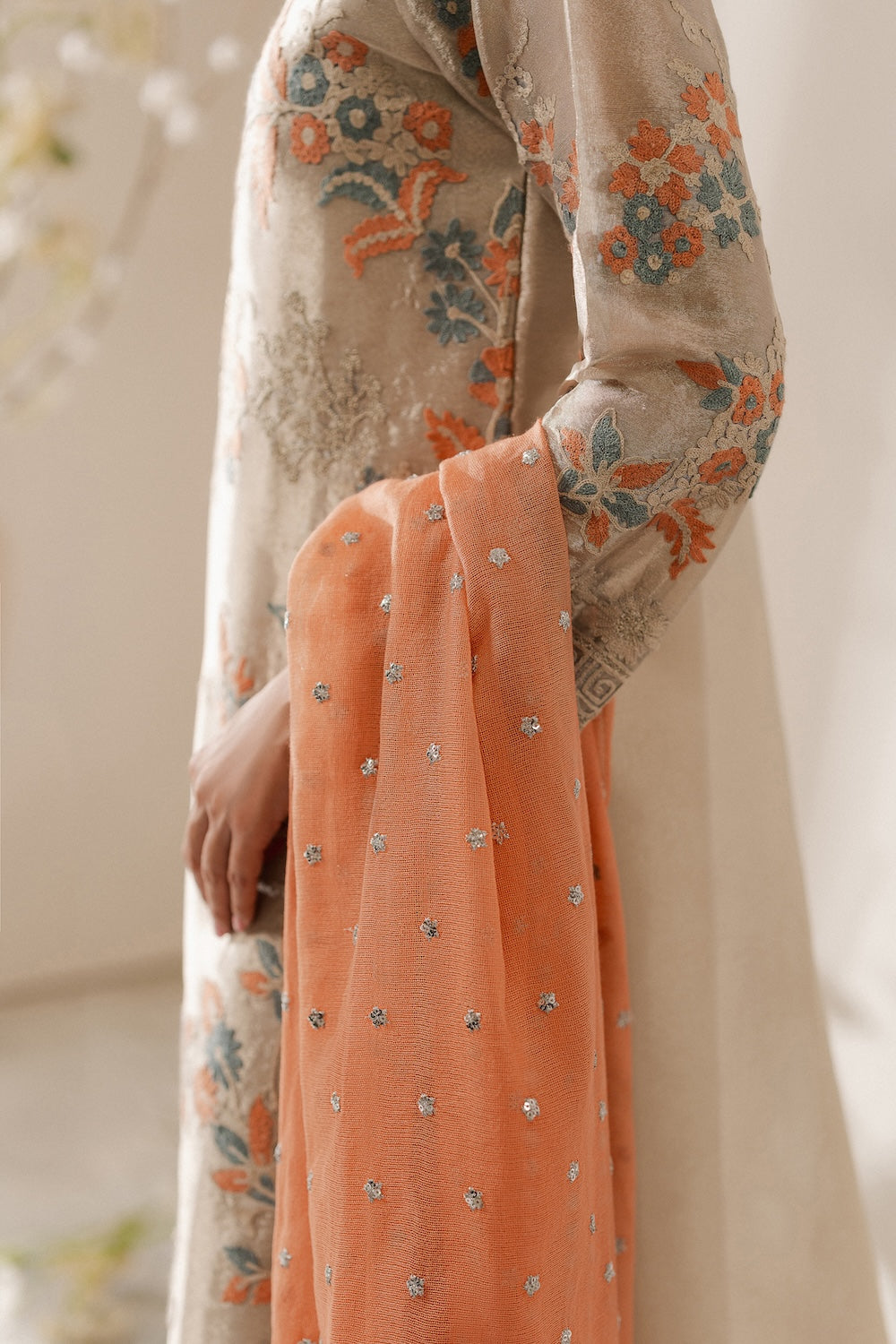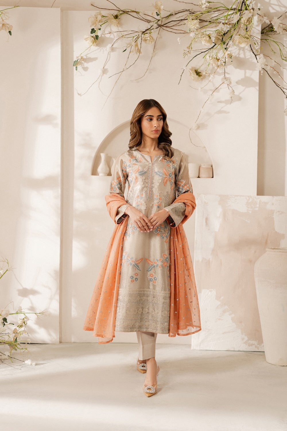 A timeless tale with a contemporary twist, this shimmering tissue ensemble is for the woman, whose love story begins with herself and embraces the world. Beautiful hand-embroidered aari work in the hues of peach and grey on a shimmery ivory base with nature-inspired motifs.
