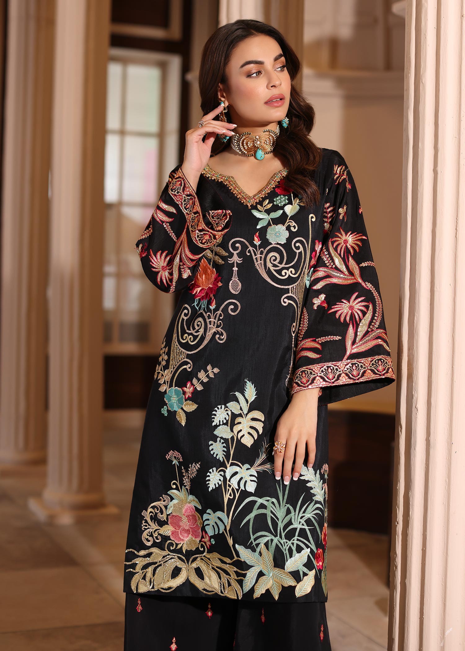 Echoes of vintage tales whisper through this black masterpiece. Every thread be it pink, see green and deep beige. Sketches a floral fantasy, set alight by matte gold sequins. The accompanying organza dupatta a promise of timeless allure. Immerse yourself in the timeless artistry of artisans with this elegant design outfit paired with four side border dupatta.