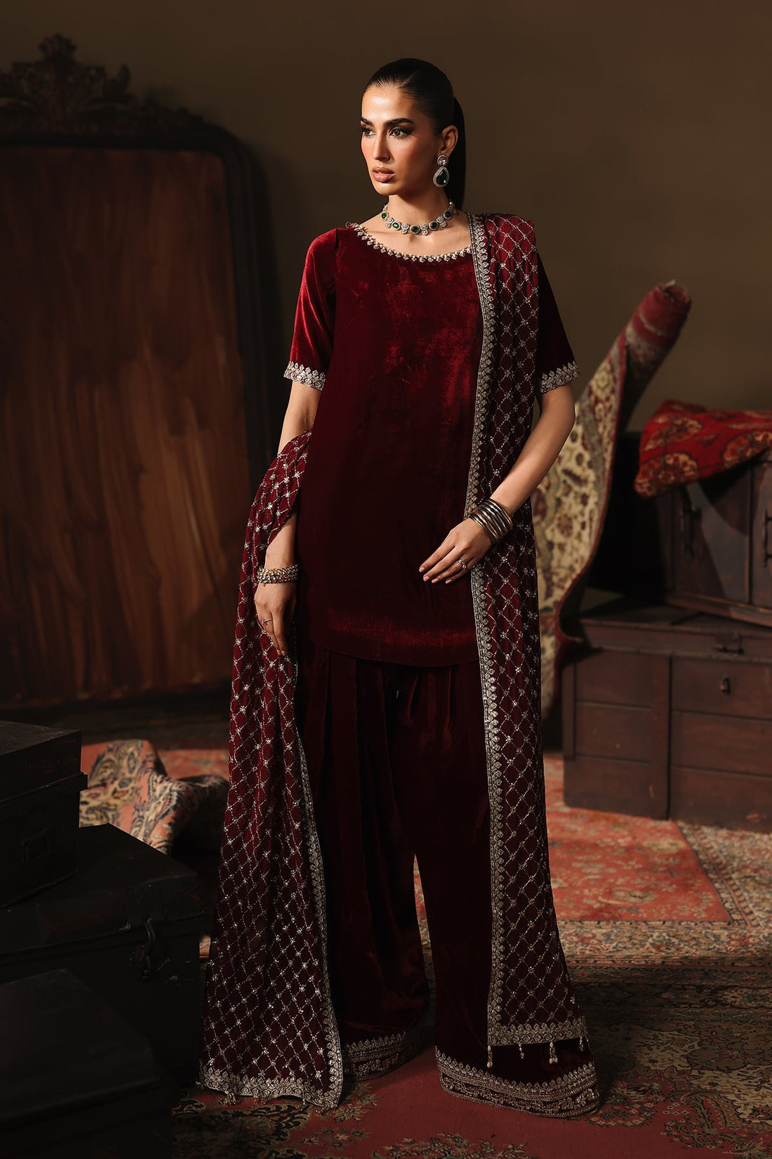Shirt:A deep maroon velvet shirt crafted in a sleek, timeless cut that highlights the fabricÂÂs...