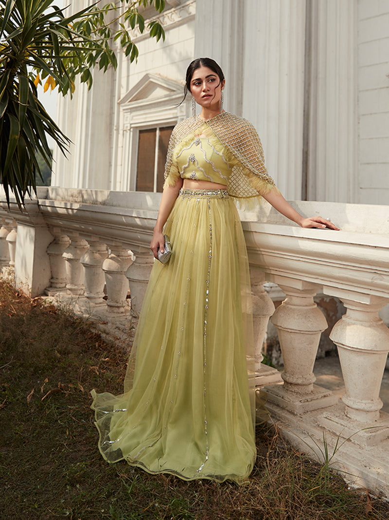 This stunning dress in a soft light green hue features beautiful embroidery of multiple shades....