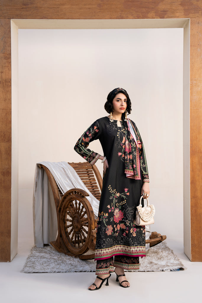 A bold black silk set with bishop sleeves and a vibrant floral print along the...