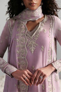 A whisper of mauve elegance this delicately embellished ensemble features intricate silver threadwork that cascades across the flowing silhouette. The tonal dupatta, framed with ornate borders, pairs effortlessly with the soft pleated sharara for a look thatÂÂs both regal and romantic. Perfect for evening soirees where every detail speaks of quiet opulence