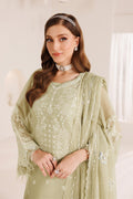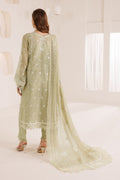 A mint green ensemble featuring delicate foil embroidery and detailed threadwork, paired with raw silk trousers and a beautifully embroidered chiffon dupatta, creating a perfect fusion of elegance and cultural grace. Embroidered Chiffon Front Embroidered Chiffon Back Embroidered Chiffon Sleeves Embroidered Organza Front + Back + Chalk Border Embroidered Organza Sleeves Border Embroidered Chiffon Dupatta Dyed Raw Silk Trouser.