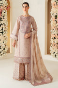 Taffy is an exquisite raw silk ensemble in a soft dusty pink, featuring intricate embroidery along the neckline and sleeves. It is gracefully paired with embroidered raw silk trousers and chiffon dupatta with contrasting threadwork, creating a subtle effect that makes it perfect for special occasions.