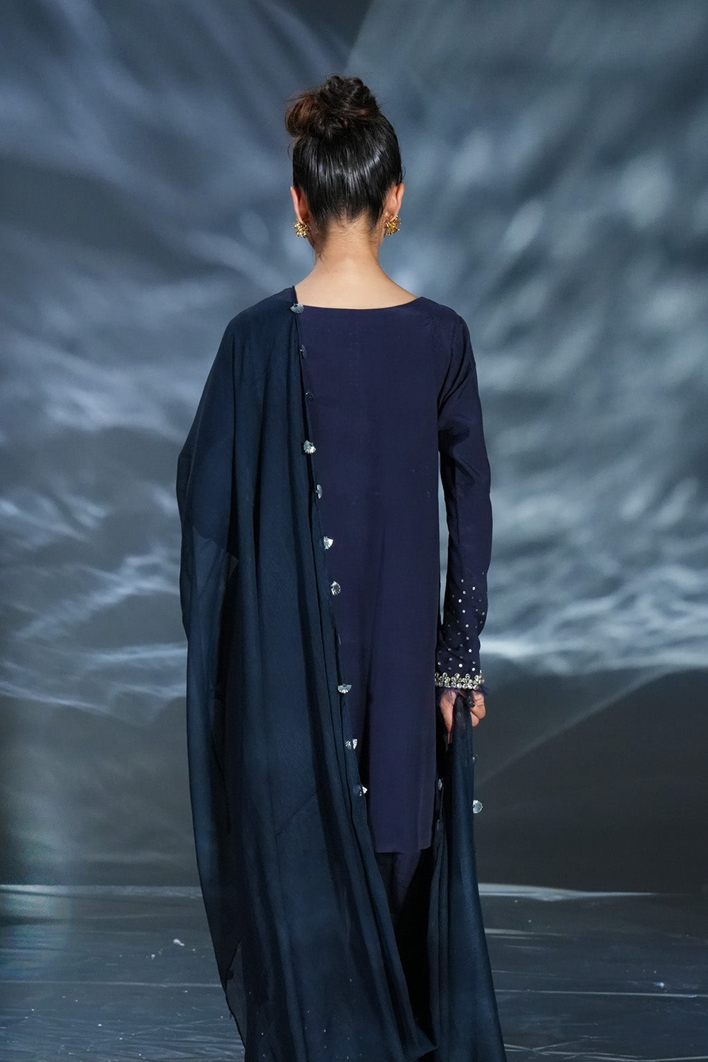 Navy blue premium silk ensemble with hand-embellished neckline, paired with hand-embellished trousers & chiffon dupatta