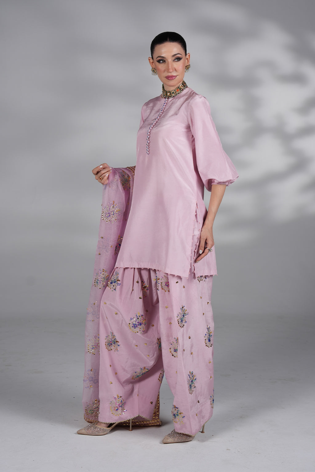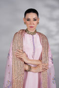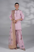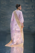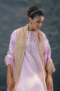 Premium silk shirt with hand embellishments, farshi shalwar with intricate handwork, and chiffon dupatta a lilac dream for festive evenings.