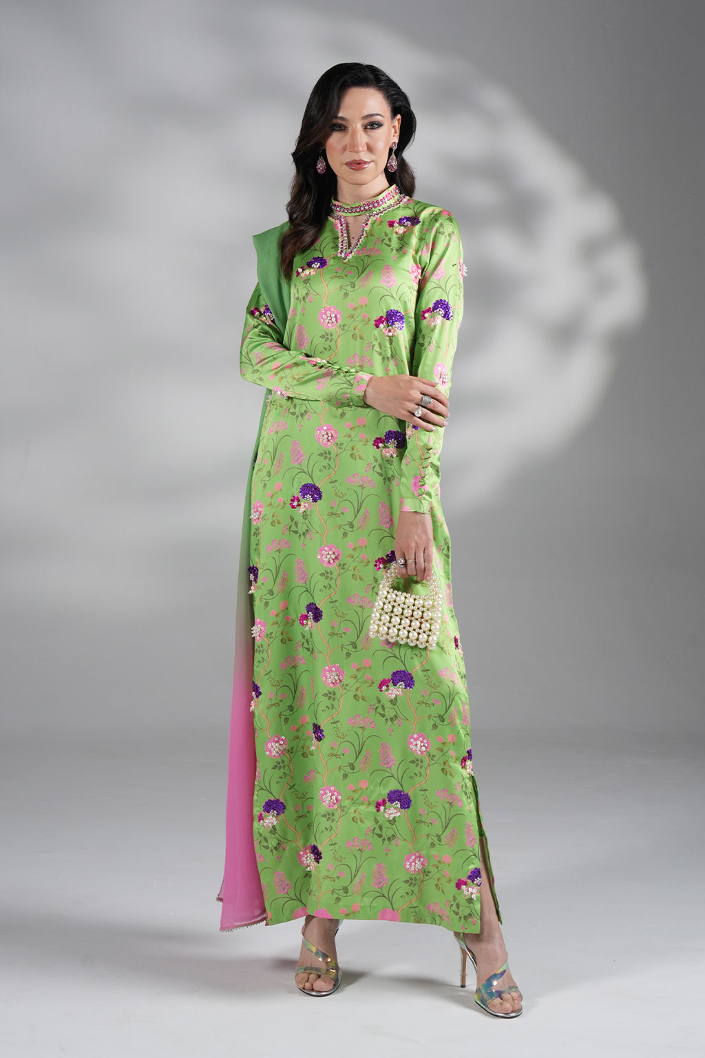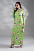 Vibrant printed green charmeuse ensemble with handwork detailing on shirt and matching trouser.