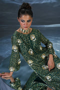 Bottle green embroidered chiffon shirt with hand embellishments, raw silk trouser & chiffon dupatta with lace detailing.