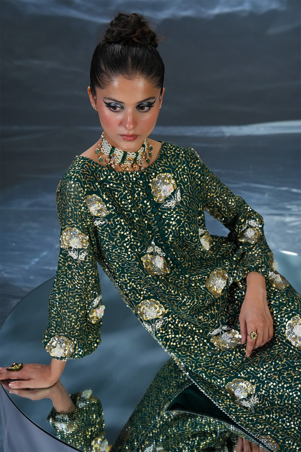 Shirt: Bottle green chiffon shirt with intricate embroidery and delicate hand embellishments