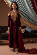 Opt for this luxurious maroon velvet kurta decked with a juxtaposition of gold silk thread embroidered neckline with burnt orange appliqued patches on the sleeves with gorgeous gota details and jewelled motifs with gold sequins sprayed all over the Kurta. It is paired with a silk block-printed dupatta and a flattering raw-silk izaar which is detailed with self jamawar borders. The ensemble is completed with a lotus potli bag with zari work accents.