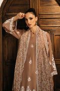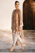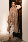 This captivating ensemble offers a playful exploration of texture and pattern. The block-printed camel shirt, featuring a contrasting ivory motif, creates a bold statement. The mirrored ivory pants with a camel block print echo the design, creating a cohesive look. The short silhouette of the shirt flatters the figure, while the skinny shalwar adds a touch of contemporary edge. A white block-printed dupatta with a camel base completes the outfit, adding a touch of airy dimension. Delicate touches of moti and sitara embellishments on the block print elevate the design with a hint of subtle sparkle.