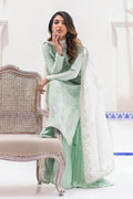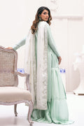 The mint kurta is a blend of elegance and style. It features a narrow shirt with a band collar, fitted sleeves, inwards cut detail on the front and back, ivory and green machine embroidery, and tassels on the sleeve hem and neckline, with moti and kardana touching, creating a sophisticated look. The pleated gharara-style pants in mint are made from raw silk, adding a touch of elegance. The ivory block print dupatta in medium silk completes the ensemble with a graceful finish.