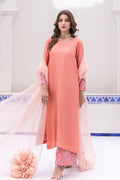 This coral ensemble is a vision of elegance and style. The 3-toned solid coral outfit features a pure raw silk long shirt with a scalloped neckline and color-blocking sleeves, adorned with embroidery and delicate 3D flowers for a stunning effect. Paired with culotte pants embellished with matching embroidery and 3D flowers, the outfit exudes sophistication and grace. The ensemble is completed with a statement organza dupatta featuring exaggerated fabric manipulated flowers, adding a touch of drama and flair.