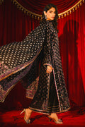 This elegant black discharge kurta set features a zardozi-embellished neckline and delicate handwork scattered throughout, enhanced with subtle gota details for a touch of shimmer. Paired with a medium silk izaar finished with gota edging and a matching discharge print dupatta, this ensemble strikes the perfect balance between timeless tradition and refined sophistication.