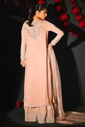 This powder pink velvet ensemble radiates timeless elegance with its embellished keyhole neckline, fitted embellished sleeves, and loop button details along the side vent. The back features organza panels with intricate embellishments, adding a graceful twist. Paired with embellished velvet Dhaka pants and a net dupatta adorned with Swarovski stone flower details, this look beautifully blends luxury, femininity, and modern charm.