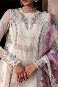 A luminous ivory ensemble elevated with delicate silver and pastel embroidery, this look blends softness with quiet refinement. The long silhouette features sheer sleeves and intricate panel work that add lightness while keeping the structure intact. Subtle floral detailing at the neckline brings a hint of color, echoed beautifully in the lilac organza dupatta draped over the shoulder its painterly blooms and scalloped edging adding a romantic, fluid touch.