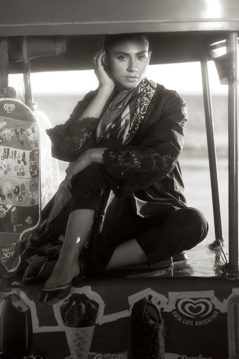 These sets blend traditional aesthetics with modern design. It features lawn fabric of darker shade with detailed embroidery on the neckline, sleeves & front border. The look is completed by a digital printed silk dupatta and matching printed trouser.