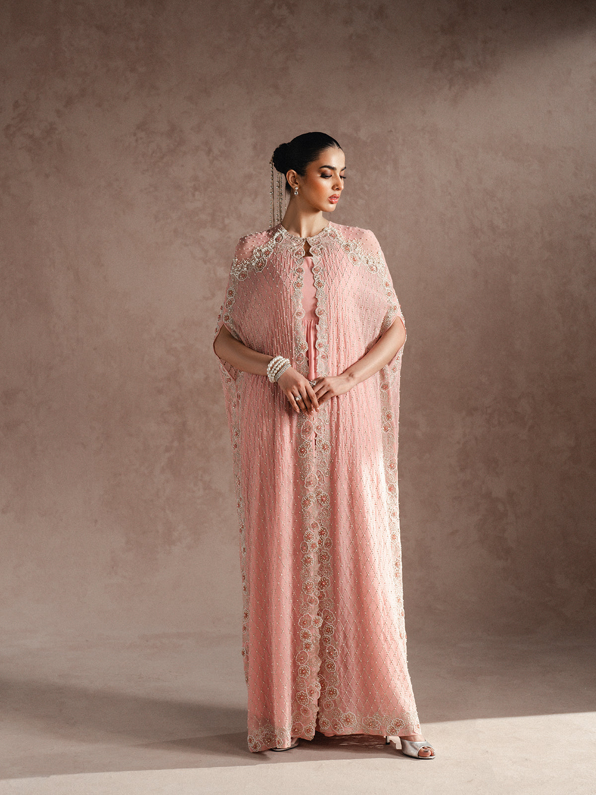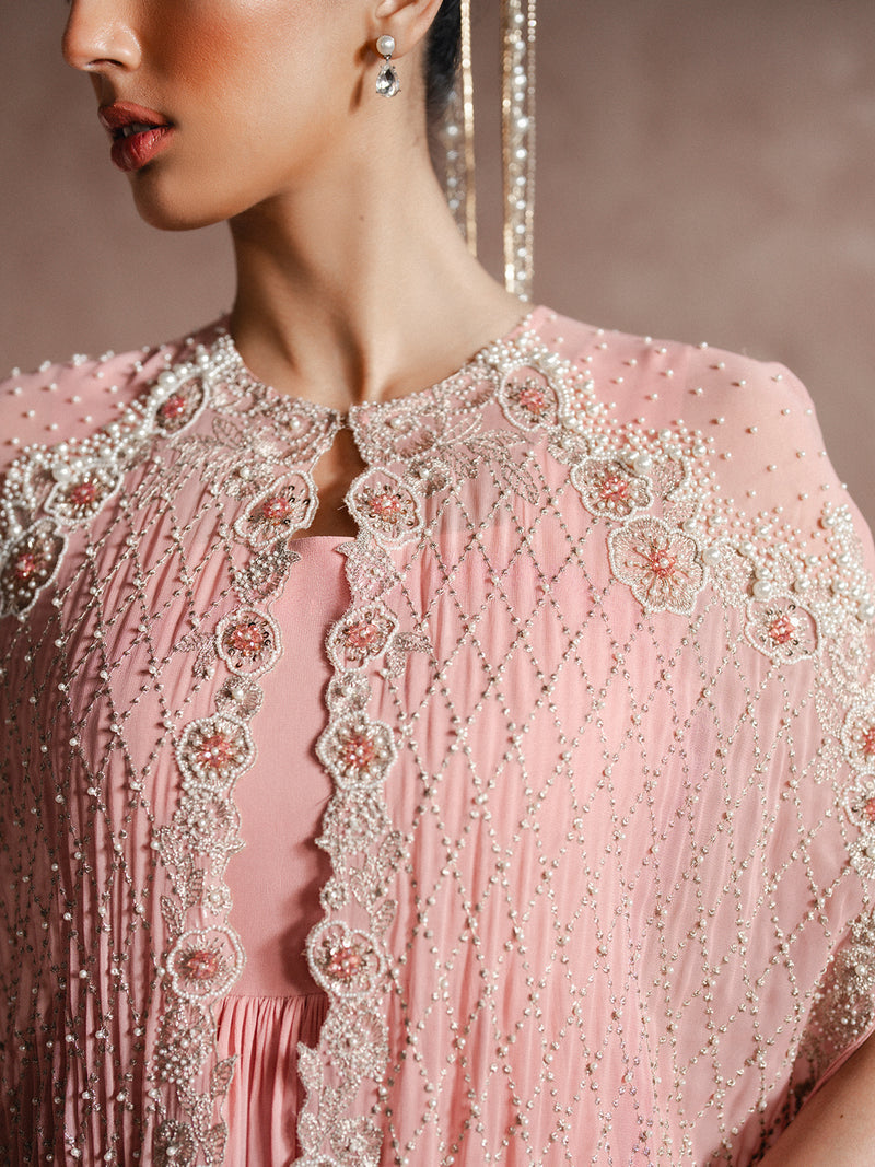 This chic pink cape, crafted from flowing chiffon, embodies effortless glamour with its exquisite hand embellishments of pearls and crystals, offering a look of unparalleled sophistication.
