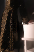 This outfits consists black velvet gown and velvet trouser paired with tasselled belt.gown is tilla embroidered and hand embellished with sequins, black and gold crystalsand cut dana.