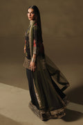 Set against a moody base, the shirt blooms with oversized botanical florals in crimson and sage, framed with antique gold tilla borders and finely detailed sleeve embellishments. Paired with a lush olive dupatta, it evokes regal grace with a contemporary spirit.