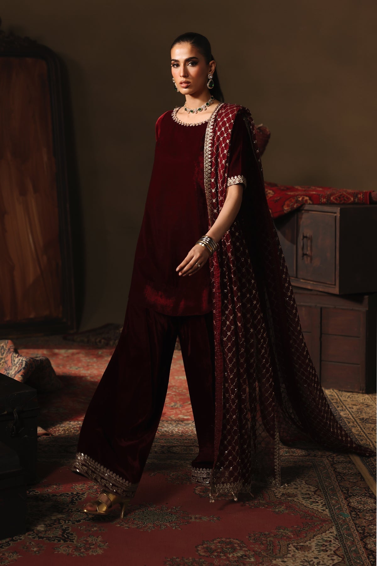 A matching maroon velvet farshi shalwar, generously flared for that classic, regal sweep. The hem is richly embellished with intricate embroidery, giving the outfit a traditional yet luxurious finish. The fall and volume of the farshi create a beautifully dramatic silhouette.