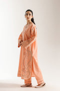 This stunning two-piece ensemble is crafted from a beautiful peach-colored fabric, serving as a graceful backdrop for its intricate designs. The long shirt features elaborate floral and vine embroidery in subtle shades of pink, green, and gold, with delicate detailing on the neckline, front, and sleeves. The suit is completed with matching trouser, making it a perfect choice for any occasion.