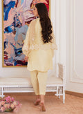 This elegant cape shirt silhouette is the look we have all been dreaming of this spring. The raw silk short shirt is gorgeously tailored with a scallop satin hem and a voluminous balloon sleeve that effortless creates a beautiful fall and drape. The canvas of refreshing pastel yellow colored shirt is attached to the most mesmerizing organza cape that features a beautiful flair and is worked generously with pearl and sequence embellishments. The scallop borders and the 3D floral bunches of the cape are adorned with hand worked detailing that instantly uplifts the entire silhouette. Paired with a tailored pant on breathable crepe, this look truly embodies a woman that is one with the world of fashion
