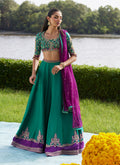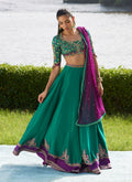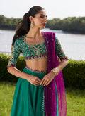 A vibrant ode to craftsmanship and color, this emerald and purple ensemble brings together traditional artistry with modern finesse. The block-printed choli shimmers with intricate handwork - kora, dabka, nakshi, resham, and crystals - creating a tapestry of texture and light. Paired with a delicately hand-embellished deep purple net dupatta and a graceful raw silk lehenga finished with subtle embroidery and playful tassels, this look is equal parts striking and sophisticated - made to dazzle at any festive celebration.