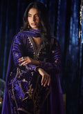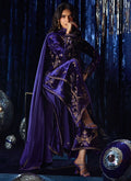 A regal masterpiece in deep purple this velvet overlap style shirt, exudes timeless allure with its extensive zari and zardozi handwork, meticulously crafted to perfection. The richly detailed embroidery enhances the luxurious texture of the velvet, creating a statement look steeped in tradition yet undeniably modern. Paired with coordinating purple izaar pants and a dip-dyed dupatta finished with a delicate zari border, this ensemble radiates graceful sophistication and festive grandeur.