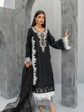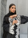 Experience elegance with our black raw silk kurta. It boasts intricate arih work on the neckline and sleeves, complemented by lace finishing on the sleeves and sides. The damaan features beautiful embroidery and lace finishing. Complete your look with a lace applique organza dupatta and a white izhaar with black embroidery details.