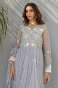 Grey pishwas adorned with resham florals embellished using zardozi, dapka abd 3d flowers