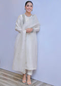 This ivory raw silk shirt is hand embellishment with beautiful silver naqshi work layered with sequins in silvers and hints of green and ice blue, paired with layered net lehnga adorned with sequin spray, completing the look with organza dupatta. Raw silk shirt: 42ÂÂ. Sharara: 45ÂÂ. Organza dupatta: 2.5 yards.