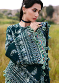 A long teal khaddar shirt featuring Kashmiri-inspired paisley embroidery on the upper body, finished with delicate embroidered borders at the slit and hem. The look is elevated with heavily embroidered traditional sleeves in monotone hues, paired with border-finished culottes and a matching wool shawl adorned with foursided embroidery, center spray, and ornate pallu corners. A perfect harmony of heritage and elegance for the winter season.