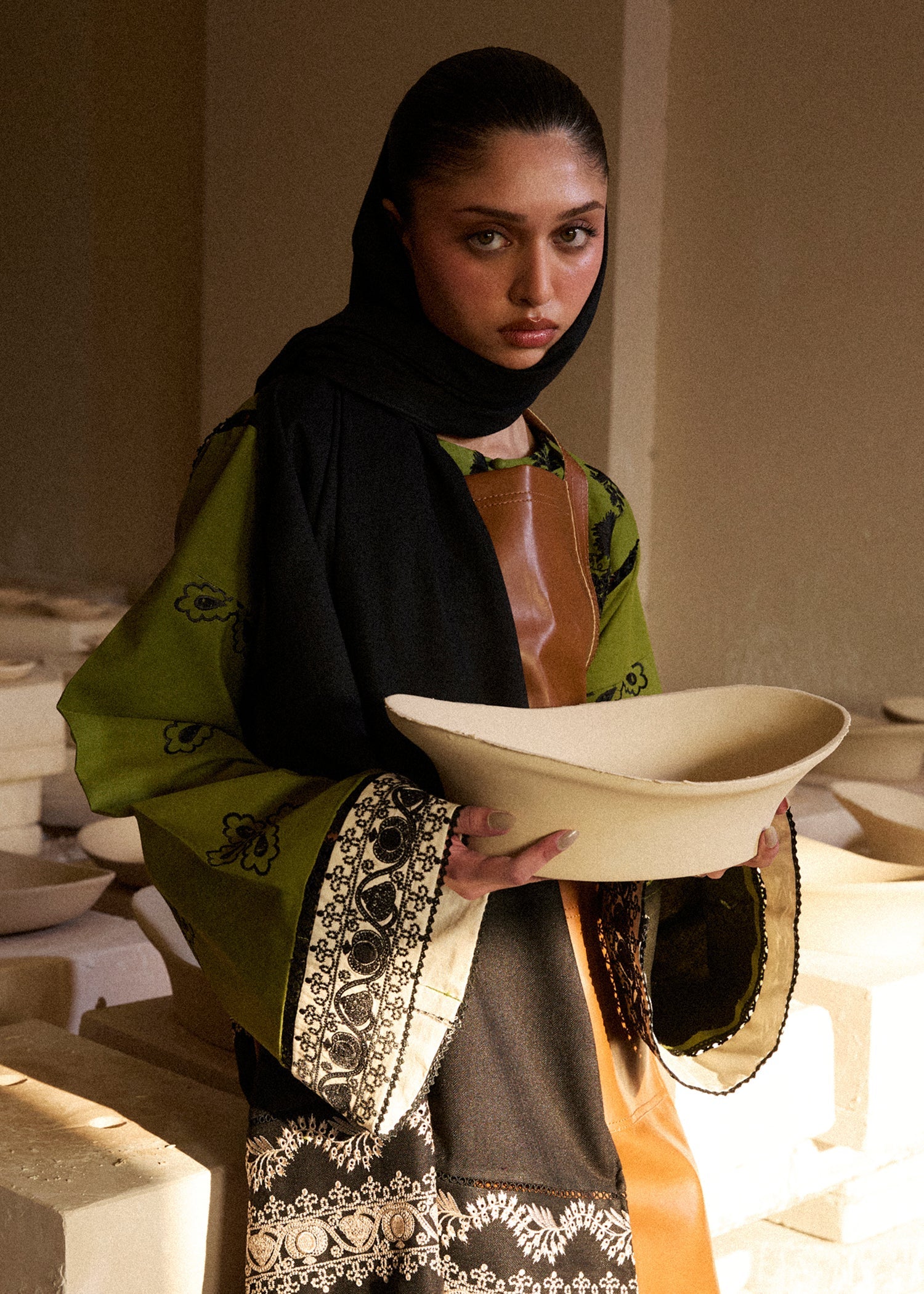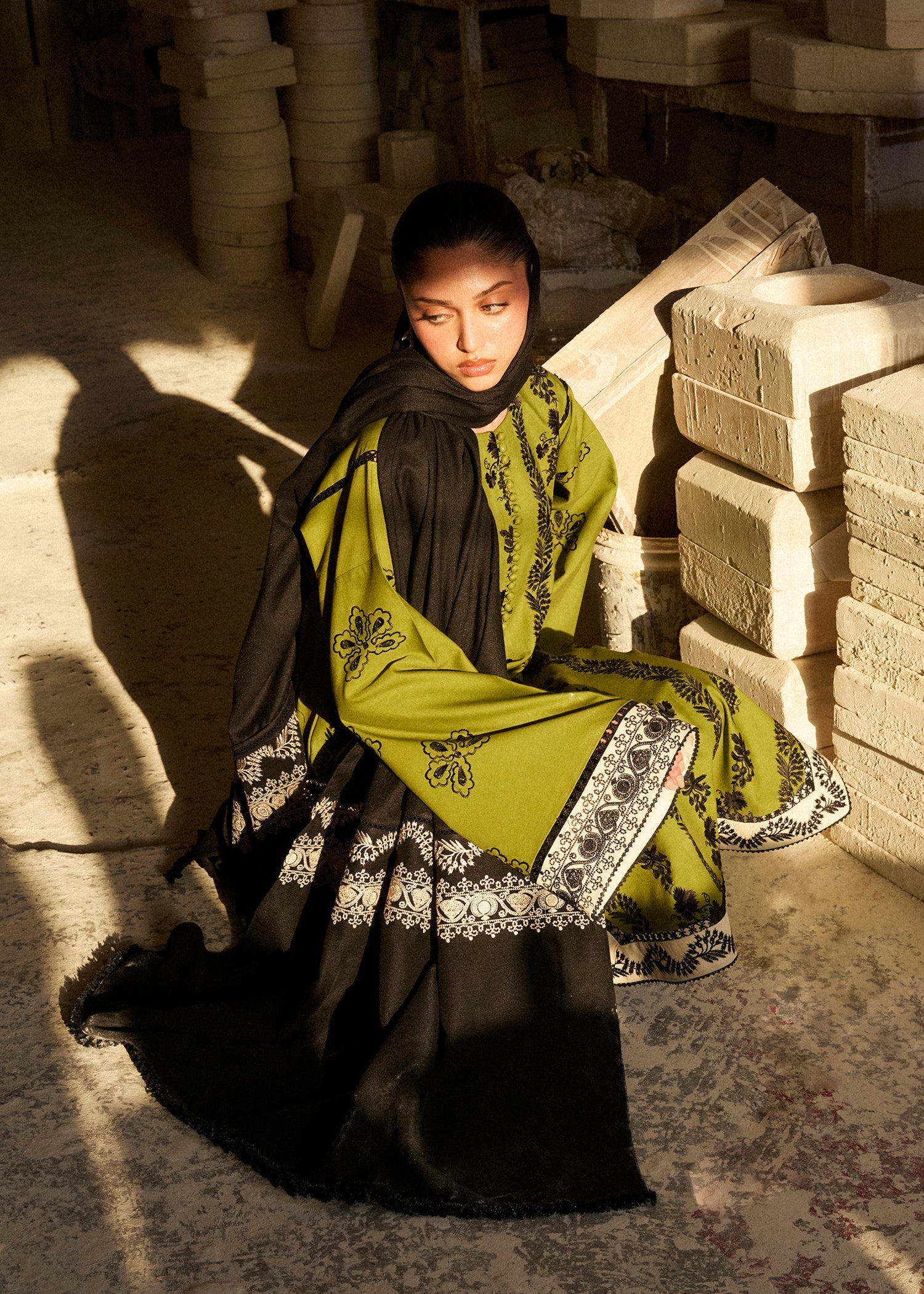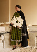 Elevate your winter wardrobe with this breathable olive green khaddar three-piece ensemble. Adorned with intricate multihead black embroidery, and ivory embroided patches on the shirt, it features sleeves with ivory embroided patch, a slit neck with loops and buttons, and with stylish embroided culottes. Paired with an embroidered shawl, this look blends tradition and trend perfect for effortless winter sophistication.