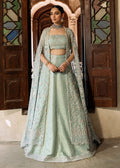This captivating fresh ice blue ensemble features a shirt, embellished bustier, and lehenga. The shirt, crafted from aqua Kathan organza, is exquisitely hand-embellished with a dazzling mix of silver, lilac, and gold tones and boasts elegant, long drapey sleeves. It is paired with a stunning flared Jamavar lehenga, adorned with a graceful booti spray and heavy embellishments along the border, creating a look of opulent sophistication. This ensemble combines intricate detailing with rich textures, making it a perfect choice for any special occasion where you want to shine with elegance and style.