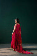 This pink crushed raw silk sleeveless frock features delicate embellishments and intricate embroidery on the bodice, complemented by a lace border for a refined touch. It is paired with a beautiful chiffon tie-dye dupatta in contrasting colors, embellished with light gotta work for a subtle yet striking finish.